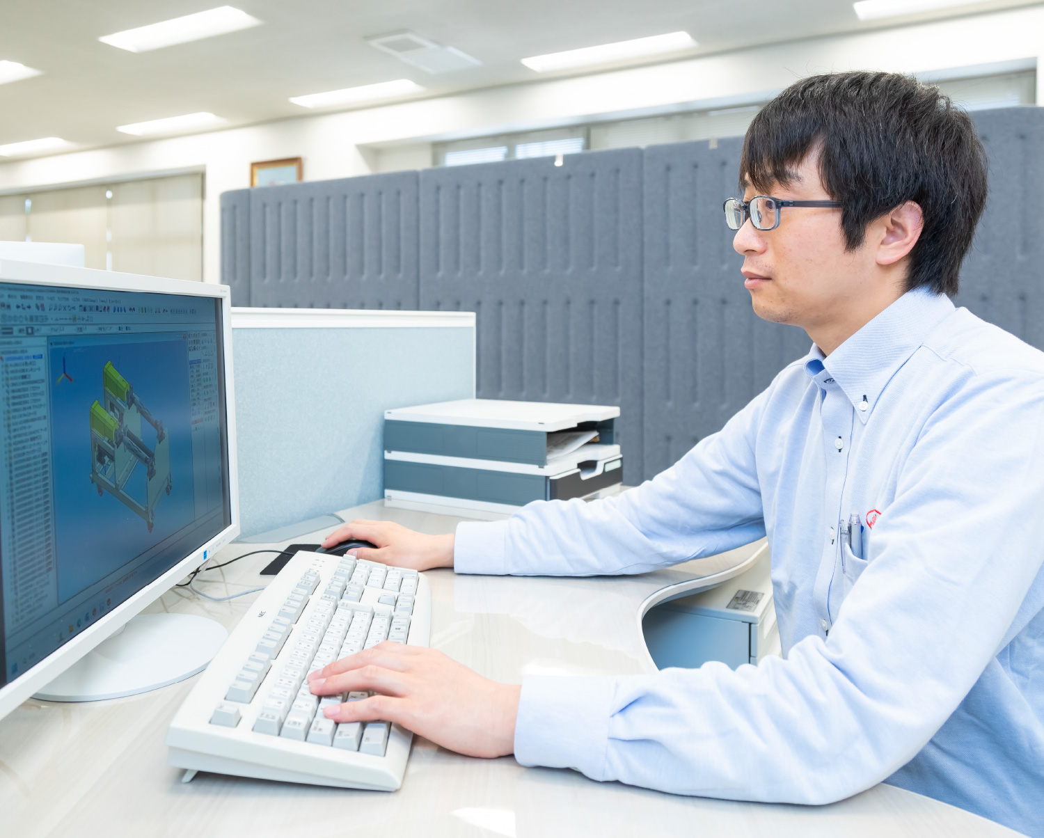 装置の設計、組立完了した装置の試運転確認作業を行っています。設計にはCADなどを操作して行います。オーダーメイドの装置なので、参考にする過去装置もなく、試作やテストを繰り返して業務を進めます。そこが新鮮で面白く、やりがいを感じる部分です。他の部署同様、海外へ出張に行くこともあります。