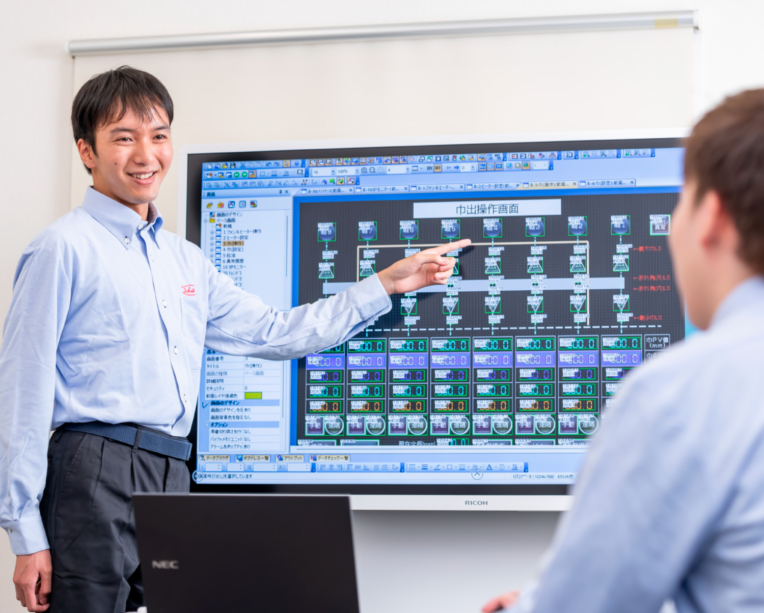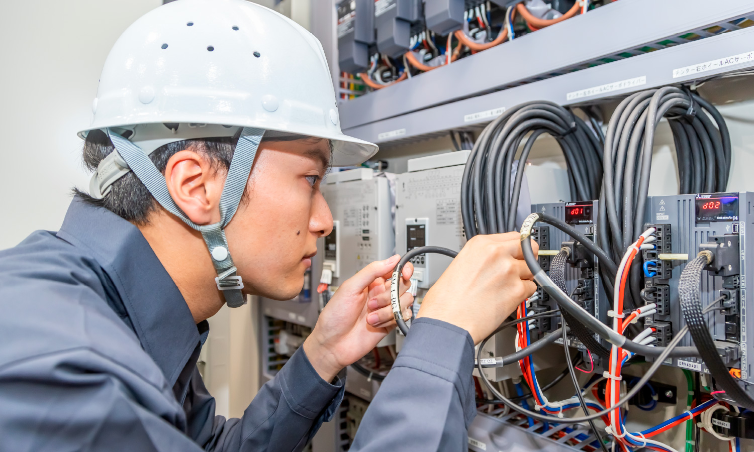 お客様や他部署との仕様を決めたり、それに合わせた資料の作成をしたりしています。現場では配線指示・確認や調整作業も行います。機械設計よりもお客様の指示やご要望によって対応が変化するため、お客様と話す機会が多く、コミュニケーション能力も必要になります。