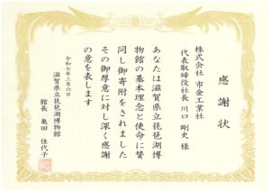 2025年3月6日 滋賀県立琵琶湖博物館 様より寄附に対する感謝状を戴きました。